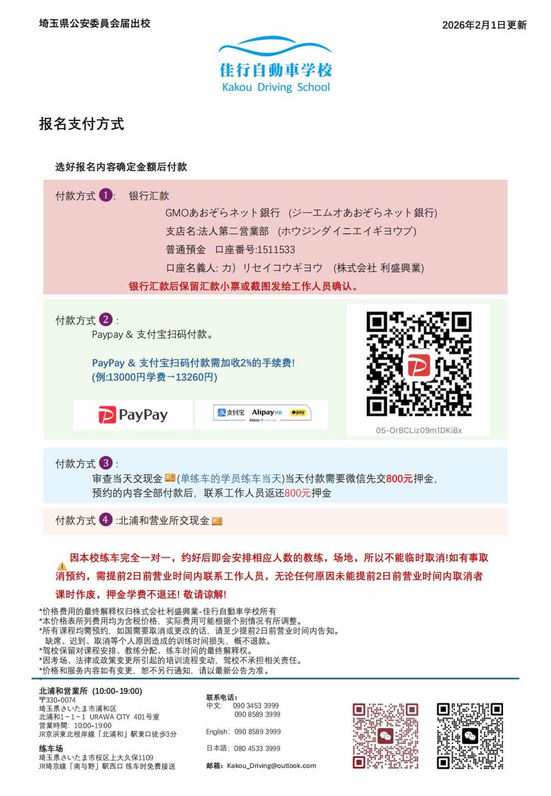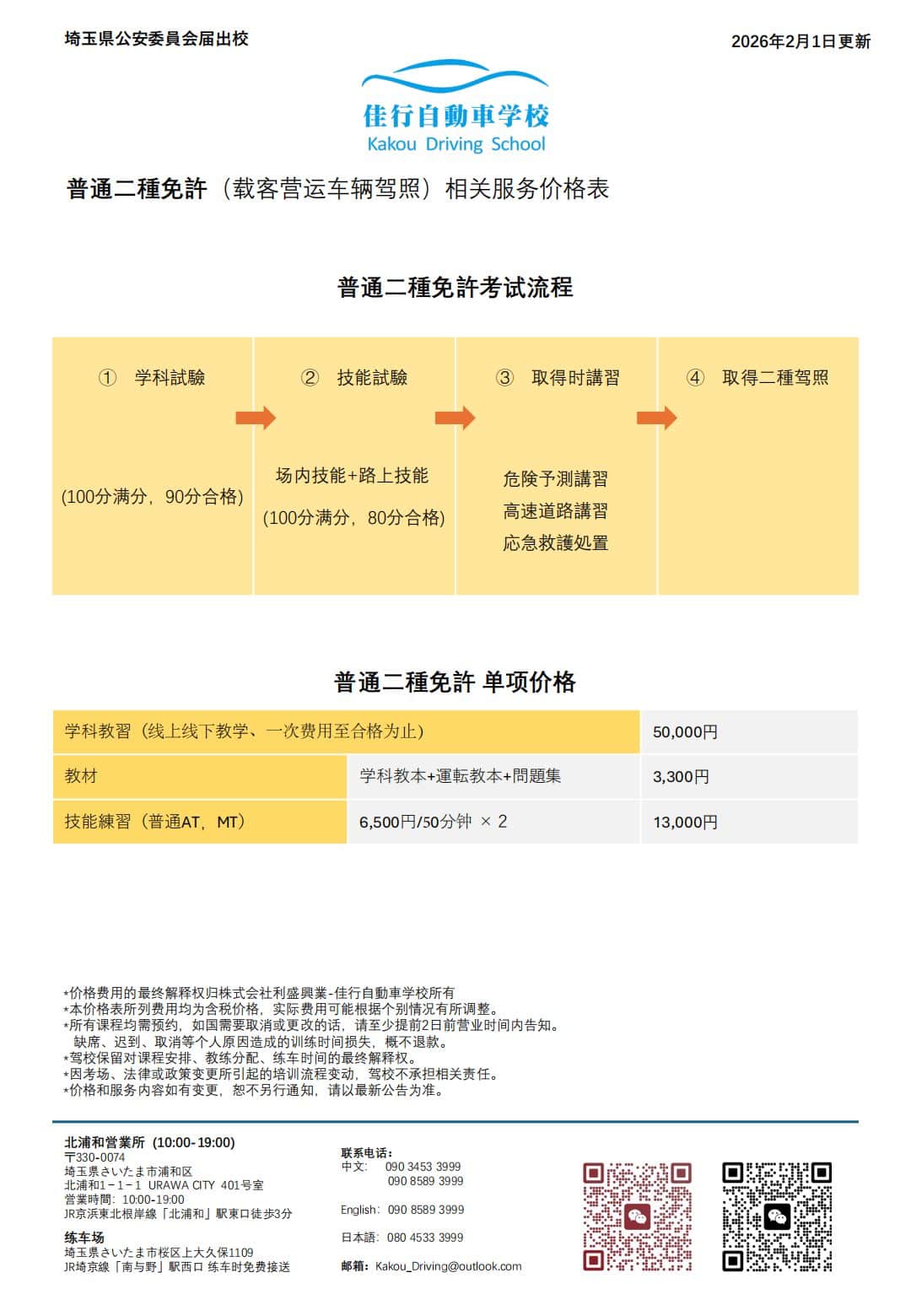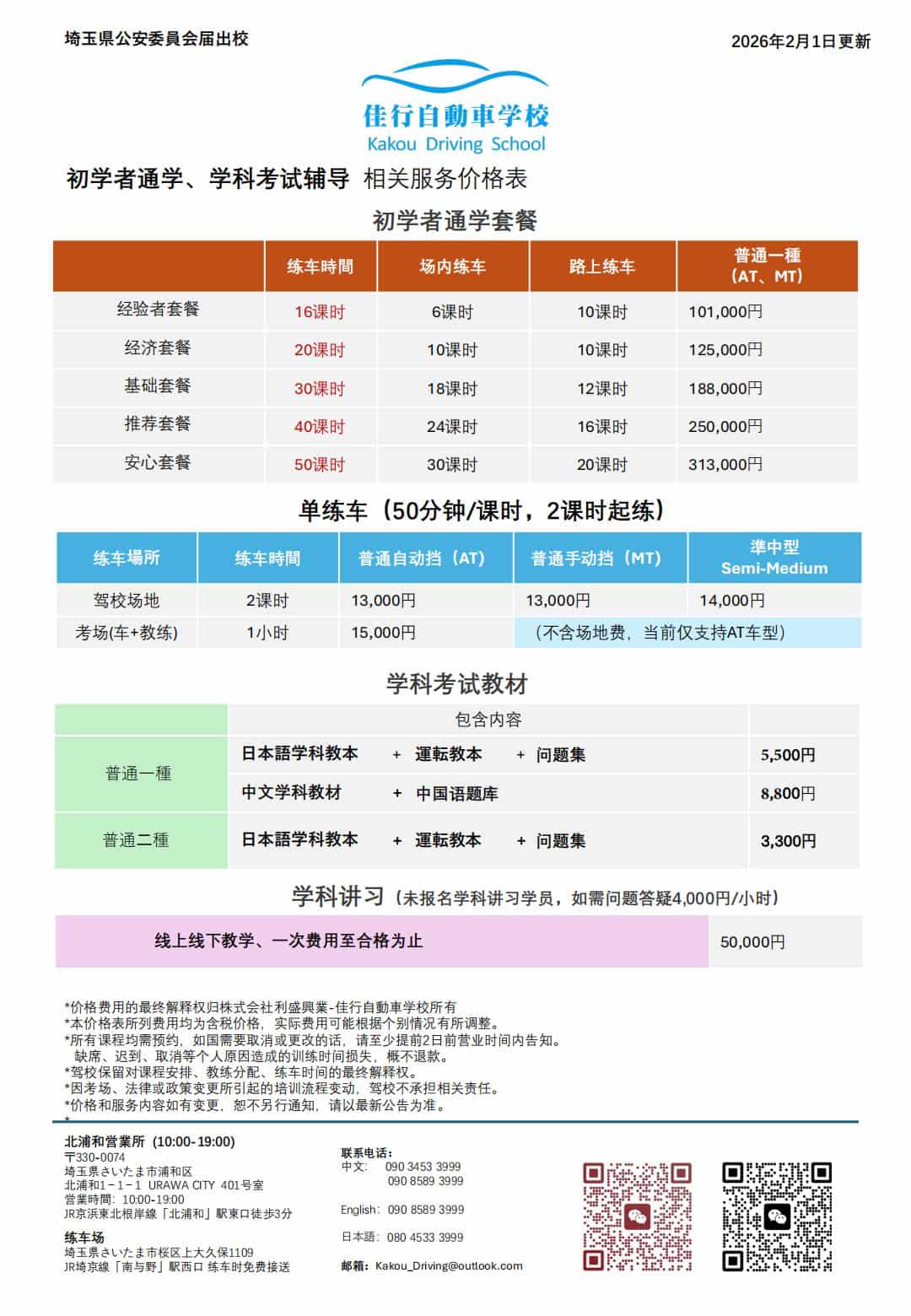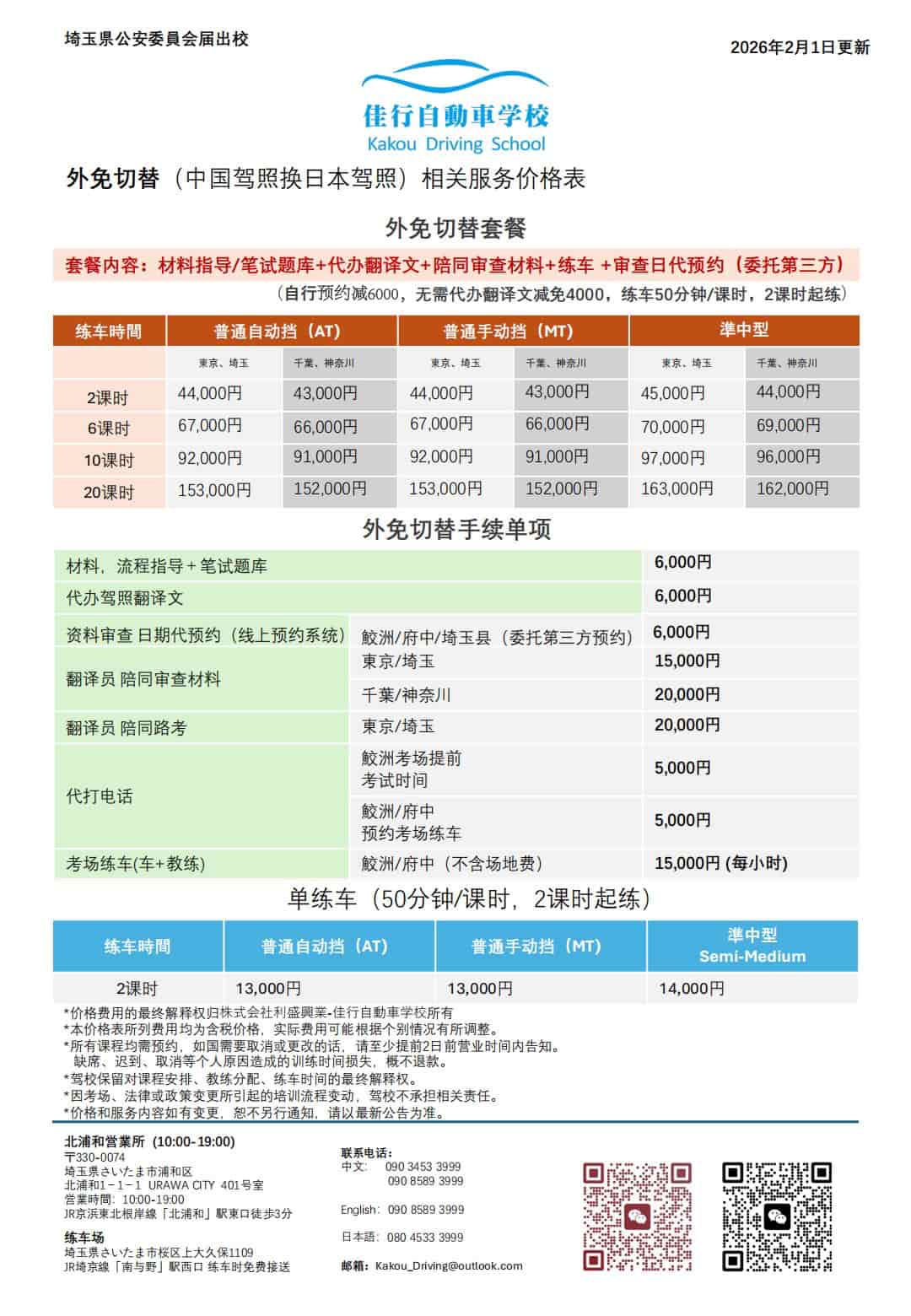 Course Fees 课程费用 佳行自動車学校的收费以「课时 × 车型 × 课程内容」为基础,所有价格均以官方价目表为准, 不收取隐藏费用。本页为您整理了外免切替、初学者通学、普通二种,以及单练车与学科辅导等项目的最新价格。 ※ 所有金额均为「含税」价格,根据价目表 2025 年 10 月 1 日版整理。 ※ 不同时间、活动或考场安排可能会有微调,以签约时说明及契约书为准。 主要课程类别概览: 先确认自己属于哪一类,再看对应区块的详细表格;如果不确定,也可以直接联系我们帮您判断。 外免切替套餐 中国驾照换日本驾照 套餐内容:材料指导/笔试题库+代办翻译文+陪同审查材料+练车+审查日代预约(委托第三方) 43,000~162,000 円 按「练车时间 / 地区 / 车型」组合收费 2 / 6 / 10 / 20 小时套餐 练车服务:普通 AT / MT / 准中型 初学者通学套餐 在日本从零开始学车 从场内基础到路上驾驶,分为经验者、经济、基础、推荐、安心五档套餐。 101,000~313,000 円 初学者通学套餐、练车服务、学科考试教材 16~50 课时不等 适合完全零基础或想系统学习的学员 普通二種免许 普通二穜(载客营运车辆驾照) 适合已有驾驶经验、想提升或准备考试的学员。 3,300~50,000 円 线上下下教学、一次费用至合格为止 学科校本+運転教本+問題集 技能練習 外免切替: 中国驾照换日本驾照。 初学者: 初学者通学、学科考试辅导。 普通二種: 载客营运车辆驾照。 支付方式: 选好报名内容确定金额后付款。